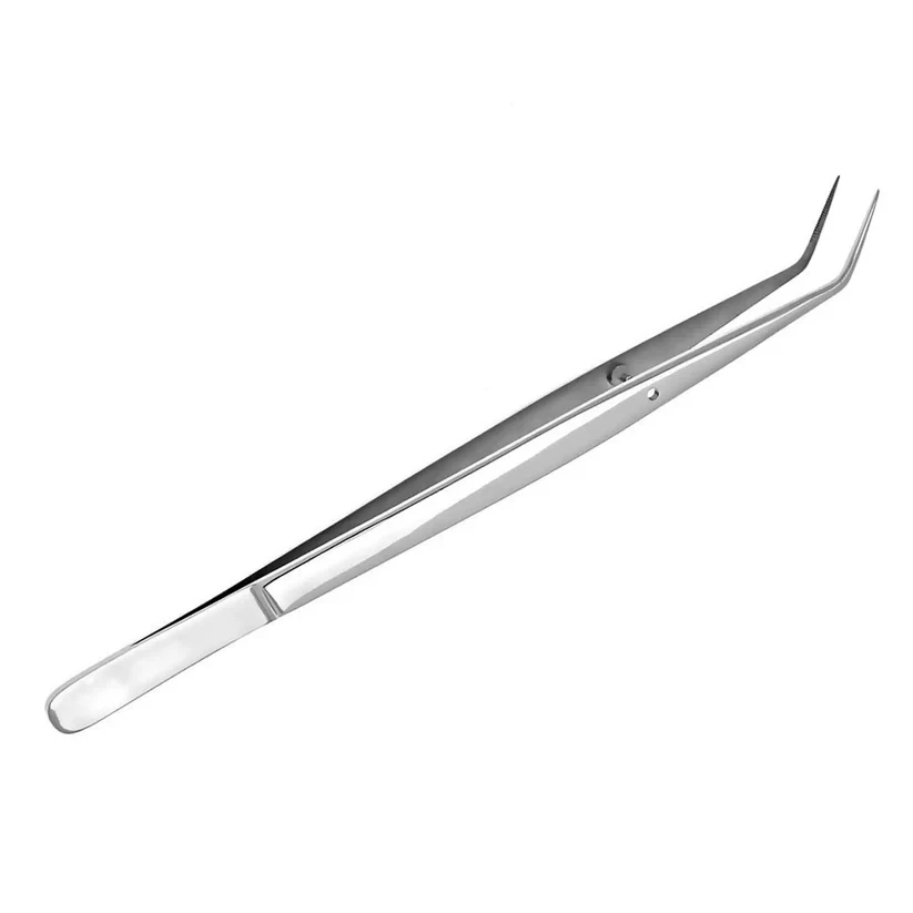 Serrated, narrow-tip college pliers are used to obtain a more precise hold and maneuver of various materials during dental procedures.