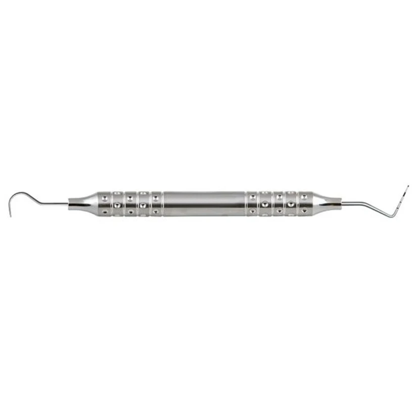 Double-ended instrument with explorer 23 on one end and probe CP-12S with 3.5-5.5-8.5-11.5 marking.on the other. Excellent for dental examinations and charting.