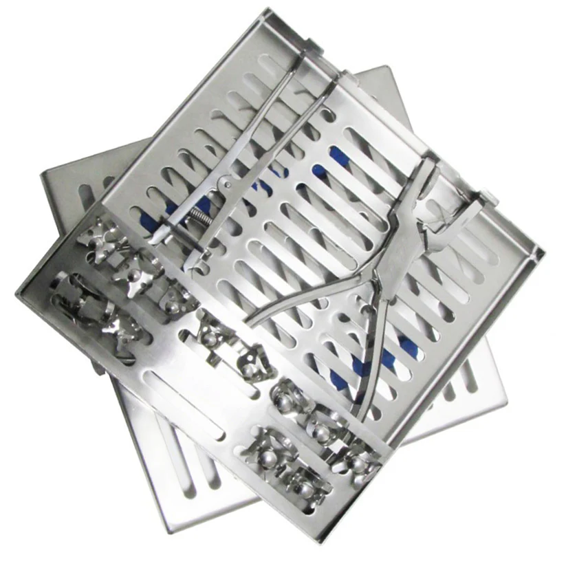 Rubber dam Stock forceps 17 cm, Rubber dam 12 clamps with holder, Ainsworth punch pliers, instruments tray